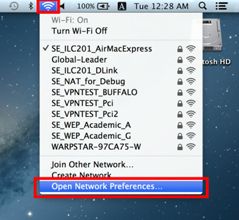 在 Mac 界面的右上角点击网络图标。点击菜单中的 "Open Network